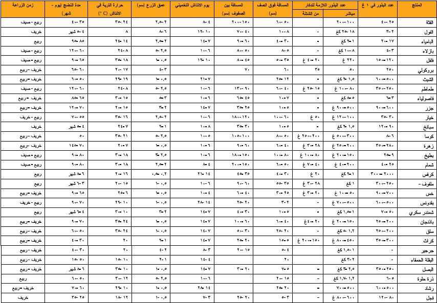جدول شامل للزراعة